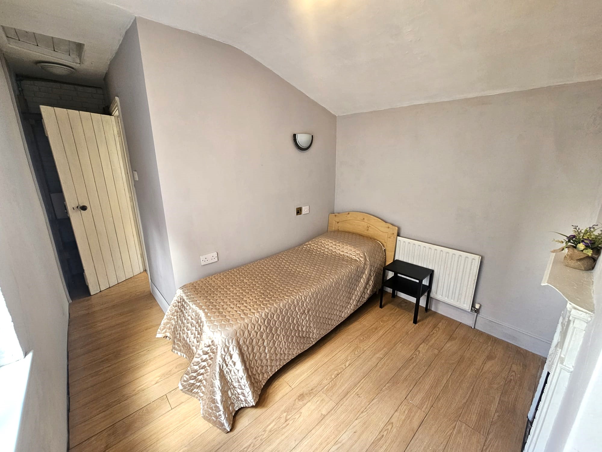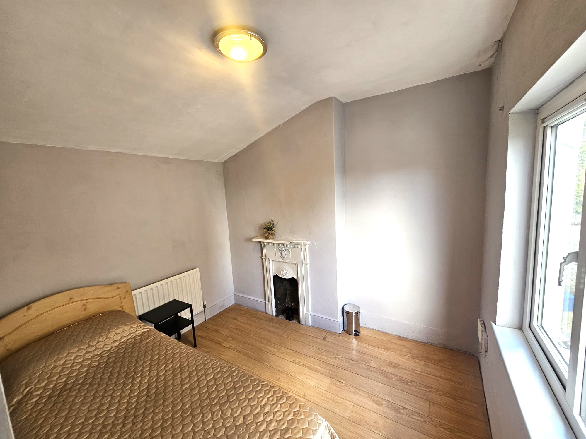 This single bedroom has one window to the side of the property, laminate timber flooring, two light pieces, a fireplace, one radiator, neutral décor, access to storage space, wall-mounted shelving, and three power points.