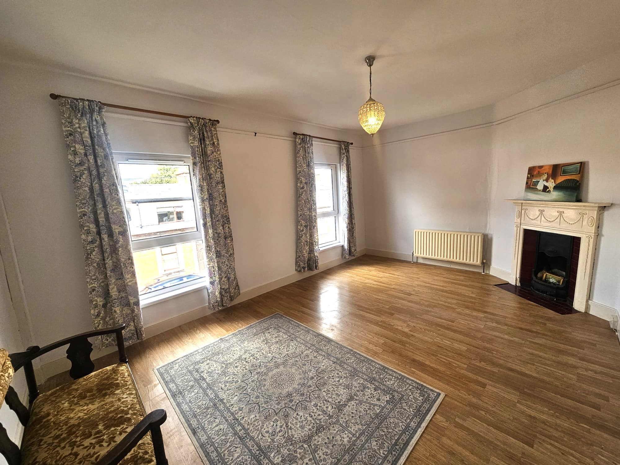 A superb and spacious double bedroom has two windows overlooking the front of the property, flooding the area with extensive natural light. The room has laminate timber flooring, a feature cast iron fireplace, neutral décor, one centre light piece, one radiator, and two power points.