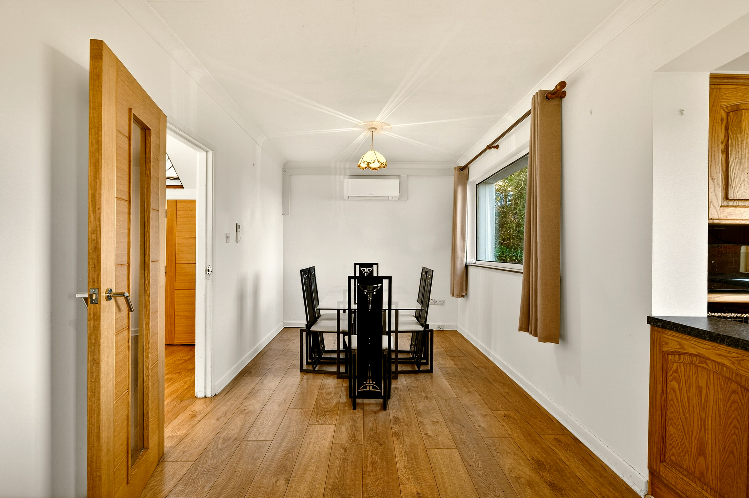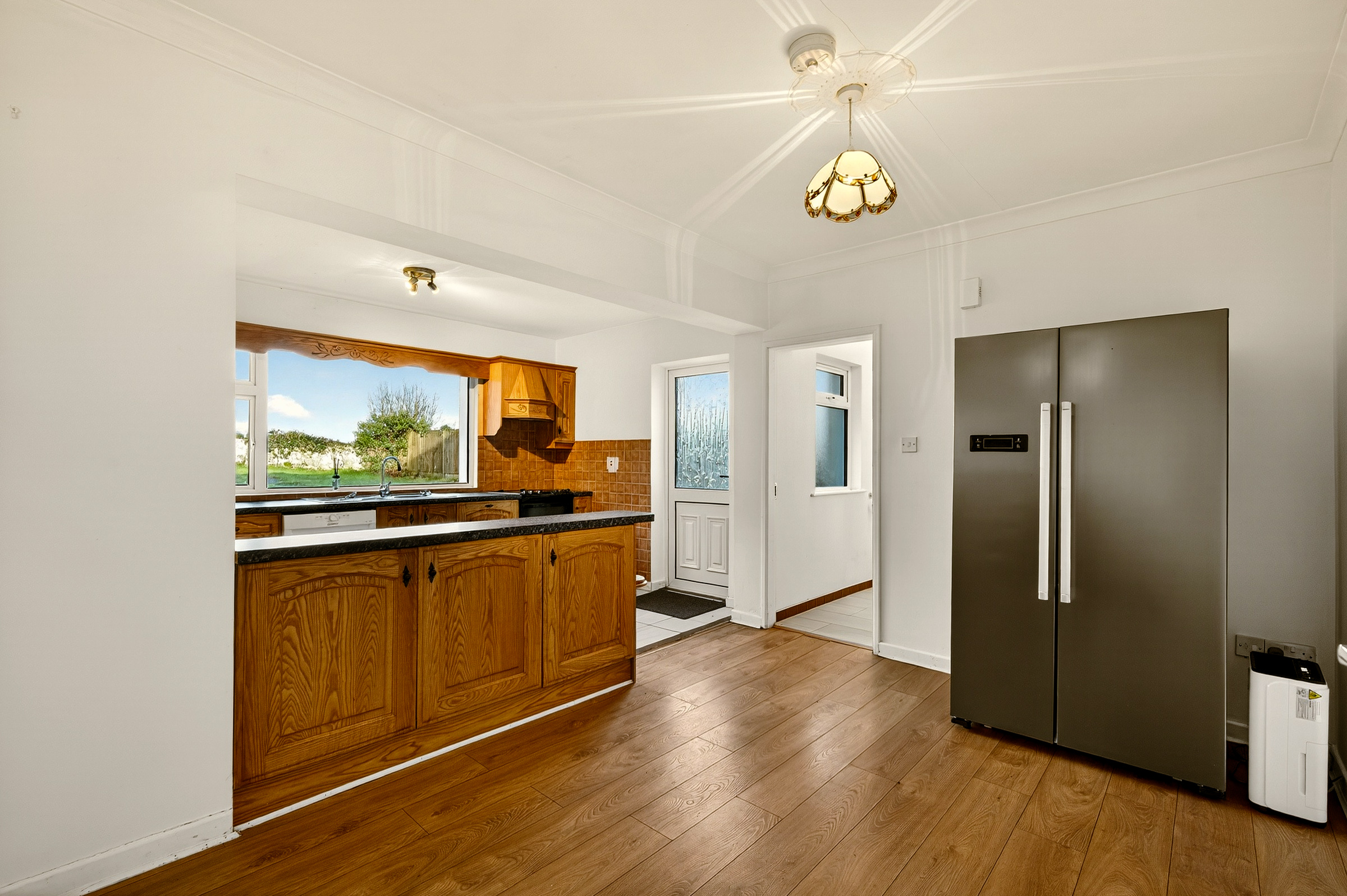 This dining room has timber flooring, one window to the rear, one radiator, one centre light fitting, and an open arch leads you through to the kitchen.