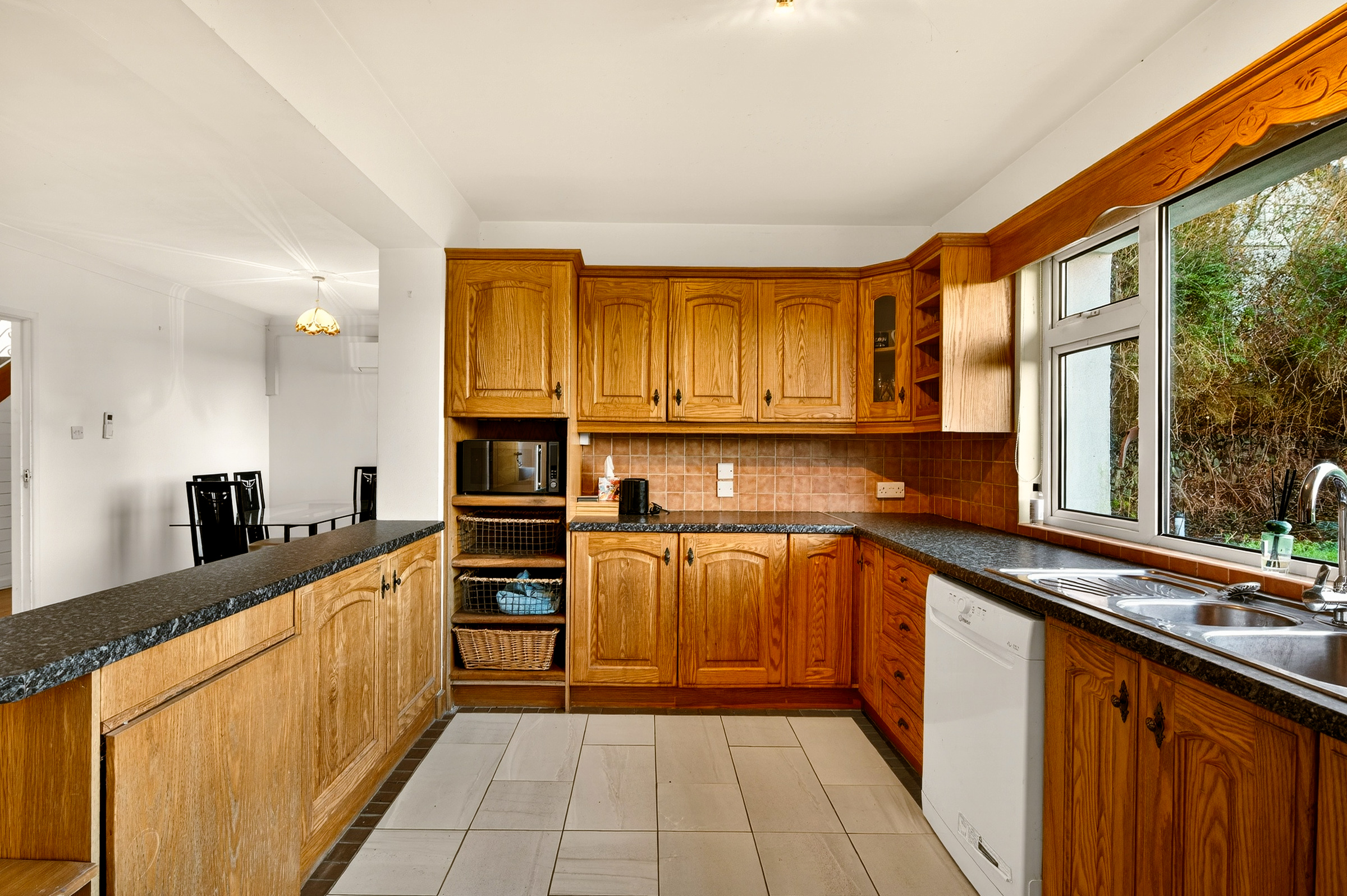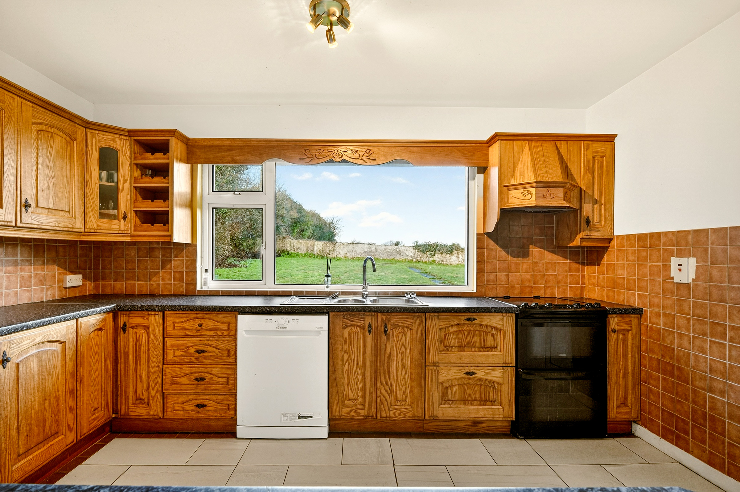The kitchen features solid fitted units at eye and floor level with extensive worktop counter and tile splashback. The kitchen includes space for an oven/hob/extractor fan, space for a fridge freezer, space for a dishwasher, and storage space. There is one window overlooking the rear garden, a PVC door allowing access to same, centre light fitting, tile flooring, and ample power points. A second door from the kitchen allows access to the guest w.c.